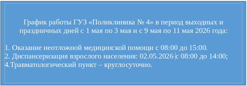 Государственное учреждение здравоохранения «Поликлиника №4» амбулаторно-поликлиническое учреждение, в состав которого входят: поликлиника, круглосуточный травматологический пункт, женская консультация и Центр здоровья.